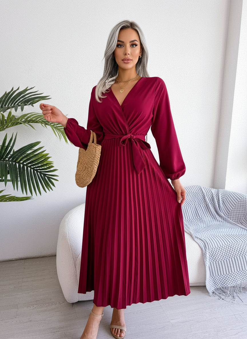 Elegant women’s pleated maxi dress featuring a flattering V-neckline and long sleeves. This timeless design combines sophistication and comfort, perfect for both formal occasions and stylish everyday wear. The flowing pleated skirt adds graceful movement, while the tailored fit enhances a feminine silhouette.
