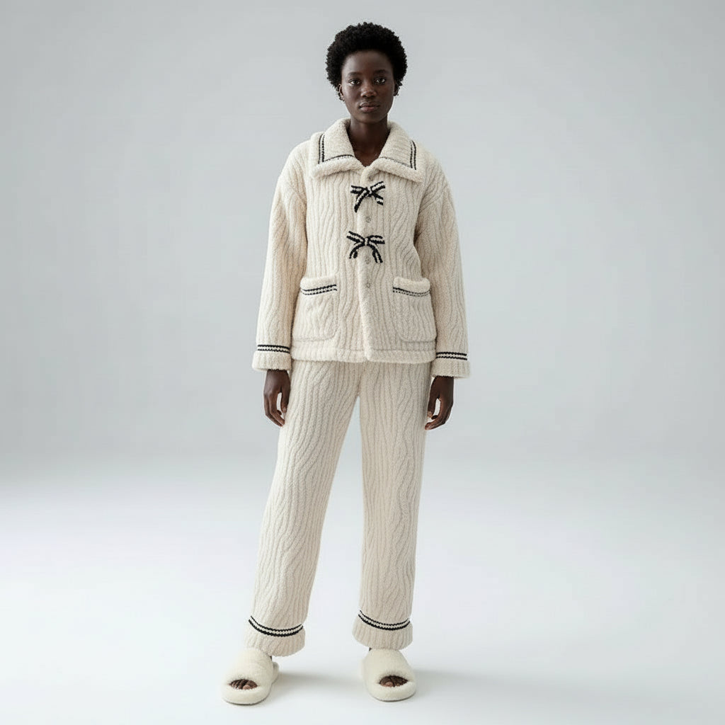 Warm and cozy two-piece women’s pajama set, perfect for autumn and winter. Made with thick, soft, and fluffy fabric, it keeps you comfortable and snug at home. Stylish princess-inspired design, ideal for relaxing, lounging, or sleeping.